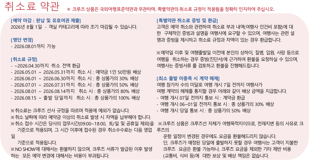 * 출입국 서류 관련 문제로 출입국이 불가능한 경우 그 책임은 여행자 본인에게 있으며, 당사나 크루즈 선사는 책임을 지지 않습니다.
